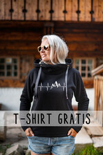 Koszulka Damska z górskim rytmem serca- w tym samym rozmiarze co zakupiona Bluza Damska z Kapturem- Gratis Koszulka czarna damskaPiękna i kobieca dzianinowa bluza dresowa damska w klasycznej czerni z motywem gór- idealnie nadaje się na prezent dla miłośników górskich wycieczek