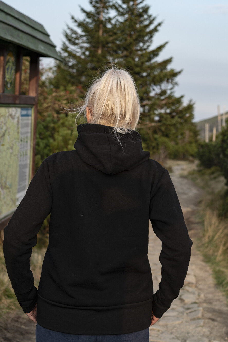 Wykonana z doskonałej jakości bawełny czarna damska bluza z kapturem i górami, to bluza którą pokochasz od pierwszego założenia. Czerń idealnie podkreśla urodę i pasuje na każdą porę roku - nie tylko na jesień. Damska bluza dresowa z kapturem mięciutka i super wygodna, idealna na górskie wycieczkiSama wybierasz swóją ulubioną bluze dresową z motywem gór. Jesteś niewymiarowa?
