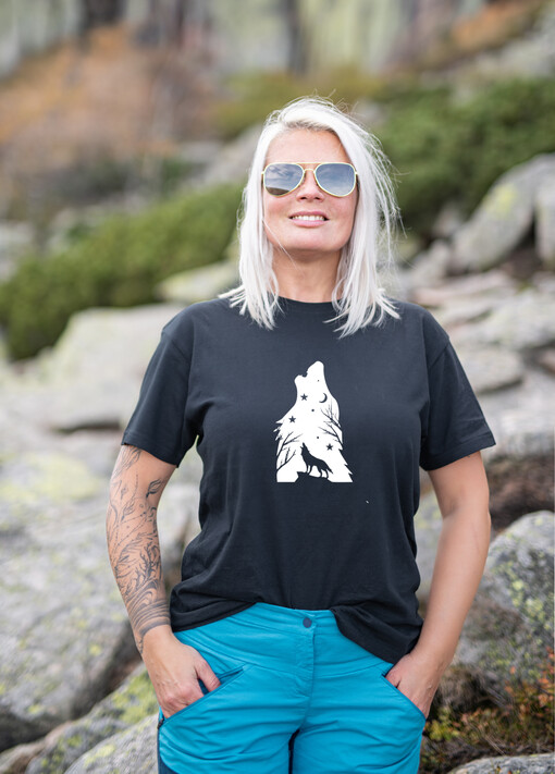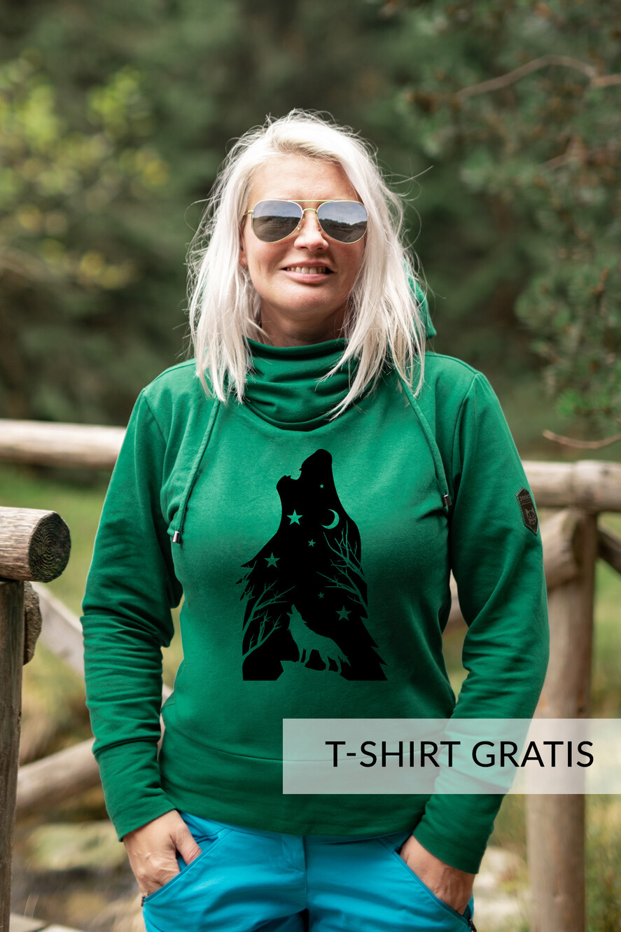 Koszulka Damska z wilkiem- w tym samym rozmiarze co zakupiona Bluza Damska z Kapturem- Gratis Koszulka czarna damska jest Dla Ciebie w prezenciePiękna i kobieca dzianinowa bluza dresowa damska w ciemniej zieleni z motywem wilka- idealnie nadaje się na prezent dla miłośników życia w zgodnie z naturą oraz jako praktyczny prezent dla fanek chodzenia po górach