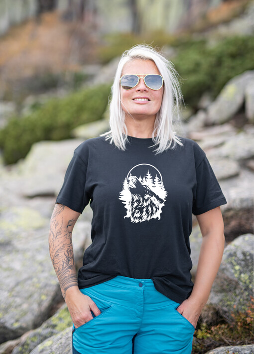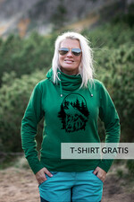 Koszulka Damska z wilkiem- w tym samym rozmiarze co zakupiona Bluza Damska z Kapturem- Gratis Koszulka czarna damska jest Dla Ciebie w prezenciePiękna i kobieca dzianinowa bluza dresowa damska w ciemniej zieleni z motywem wilka- idealnie nadaje się na prezent dla miłośników życia w zgodnie z naturą oraz jako praktyczny prezent dla fanek chodzenia po górach