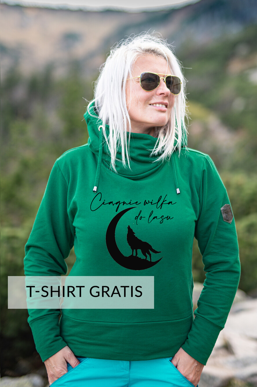 Koszulka Damska z wilkiem- w tym samym rozmiarze co zakupiona Bluza Damska z Kapturem- Gratis Koszulka czarna damska jest Dla Ciebie w prezenciePiękna i kobieca dzianinowa bluza dresowa damska w ciemniej zieleni z motywem wilka- idealnie nadaje się na prezent dla miłośników życia w zgodnie z naturą oraz jako praktyczny prezent dla fanek chodzenia po górach
