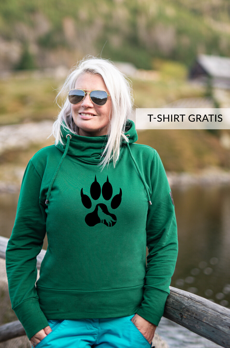 Koszulka Damska z wilkiem- w tym samym rozmiarze co zakupiona Bluza Damska z Kapturem- Gratis Koszulka czarna damska jest Dla Ciebie w prezenciePiękna i kobieca dzianinowa bluza dresowa damska w ciemniej zieleni z motywem wilka- idealnie nadaje się na prezent dla miłośników życia w zgodnie z naturą oraz jako praktyczny prezent dla fanek chodzenia po górach