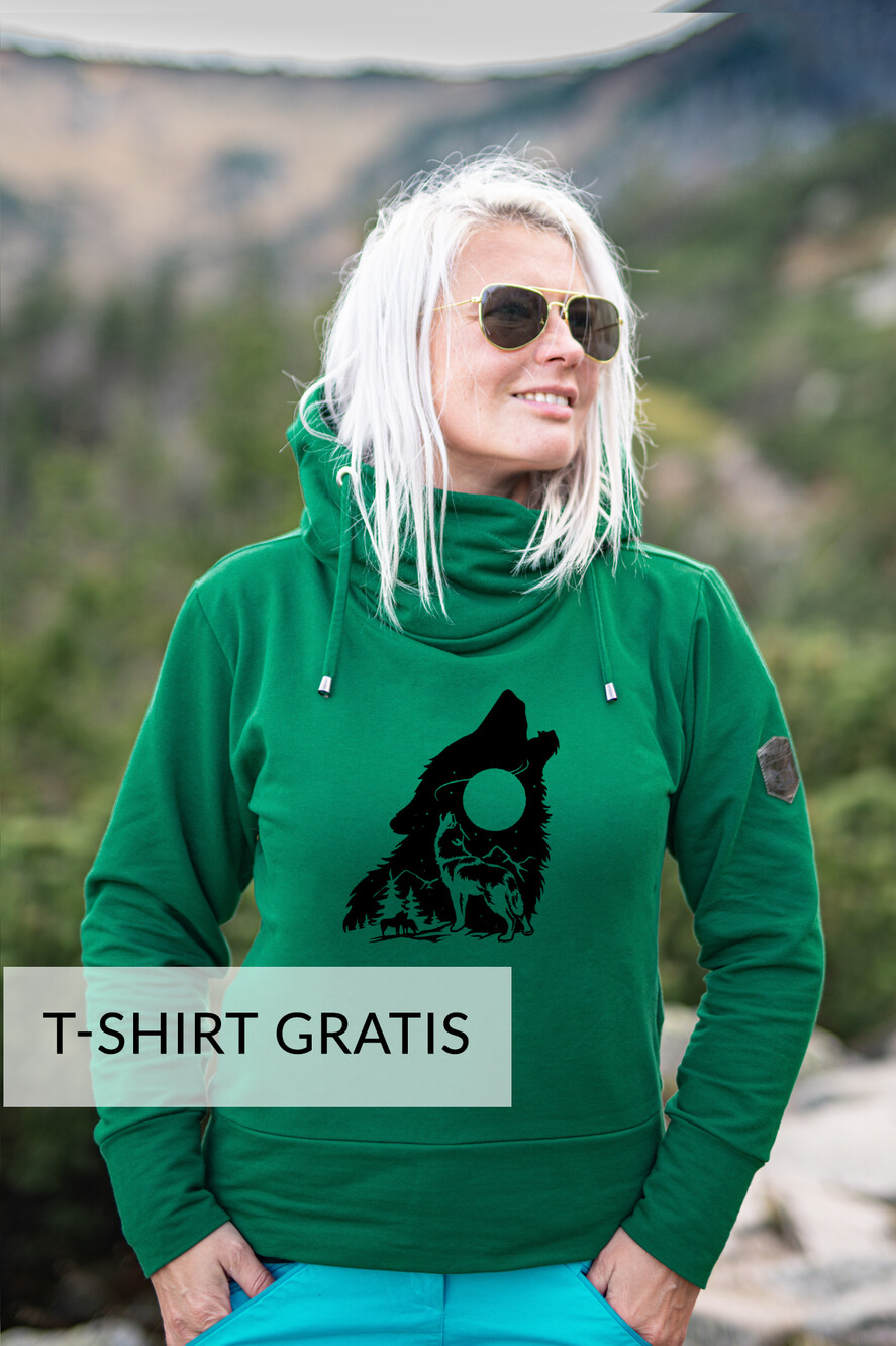 Koszulka Damska z wilkiem- w tym samym rozmiarze co zakupiona Bluza Damska z Kapturem- Gratis Koszulka czarna damska jest Dla Ciebie w prezenciePiękna i kobieca dzianinowa bluza dresowa damska w ciemniej zieleni z motywem wilka- idealnie nadaje się na prezent dla miłośników życia w zgodnie z naturą oraz jako praktyczny prezent dla fanek chodzenia po górach