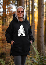 Piękna i kobieca dzianinowa bluza dresowa damska w klasycznej czerni z motywem wilka- idealnie nadaje się na prezent dla miłośników życia w zgodnie z natura dla fanek chodzenia po górach