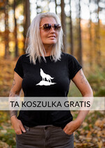 Koszulka Damska z wilkiem- w tym samym rozmiarze co zakupiona Bluza Damska z Kapturem- Gratis Koszulka czarna damska jest Dla Ciebie w prezenciePiękna i kobieca dzianinowa bluza dresowa damska w ciemniej zieleni z motywem wilka- idealnie nadaje się na prezent dla miłośników życia w zgodnie z naturą oraz jako praktyczny prezent dla fanek chodzenia po górach