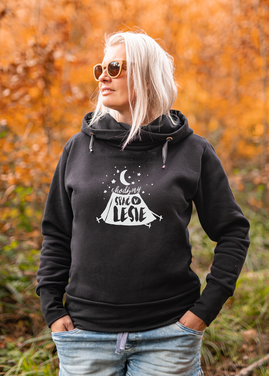 Pomysł Na Prezent dla Niej - Bluza dresowa Damska z Kapturem - chodźmy spac do lasu - Damska Czarna bluza