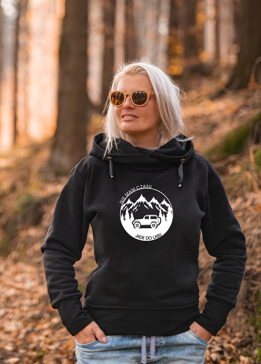 Piękna i kobieca dzianinowa bluza dresowa damska w klasycznej czerni idę do lasu- idealnie nadaje się na prezent dla miłośników życia w zgodnie z natura dla fanek chodzenia po górach i lasach