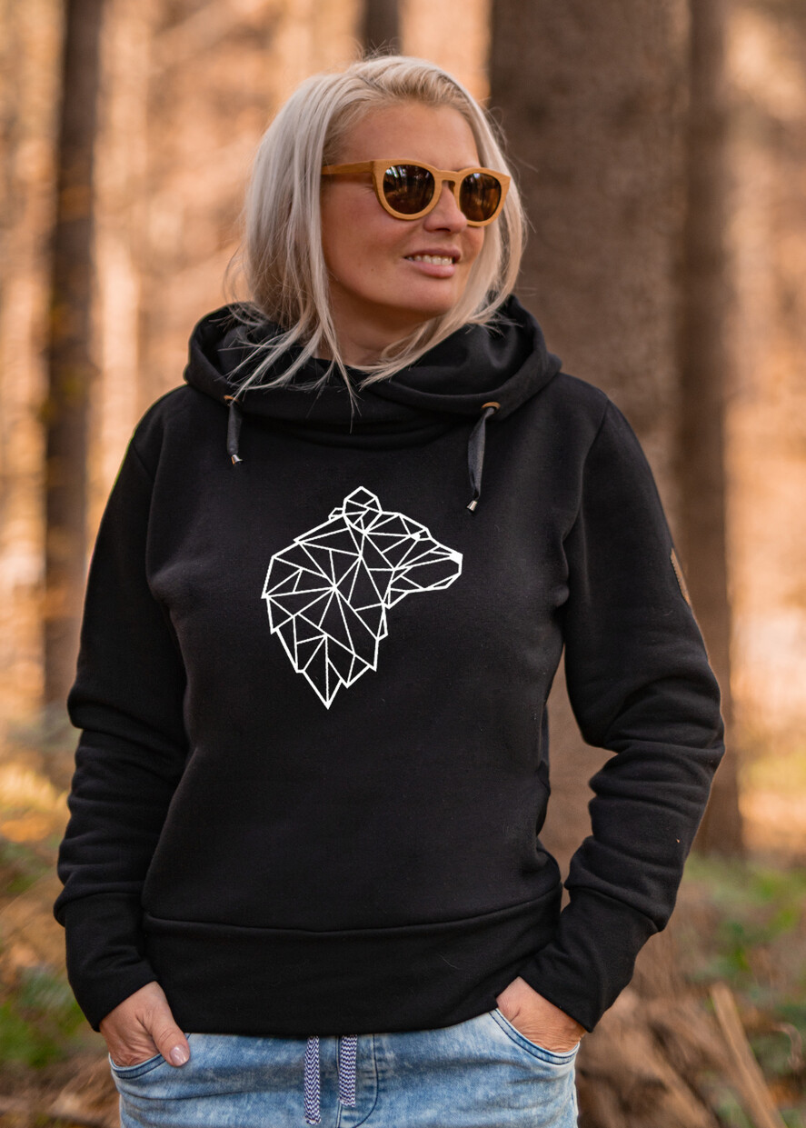 Pomysł Na Prezent dla Niej - Bluza dresowa Damska z Kapturem - Geometryczny Niedzwiedz - Damska Czarna bluza