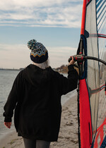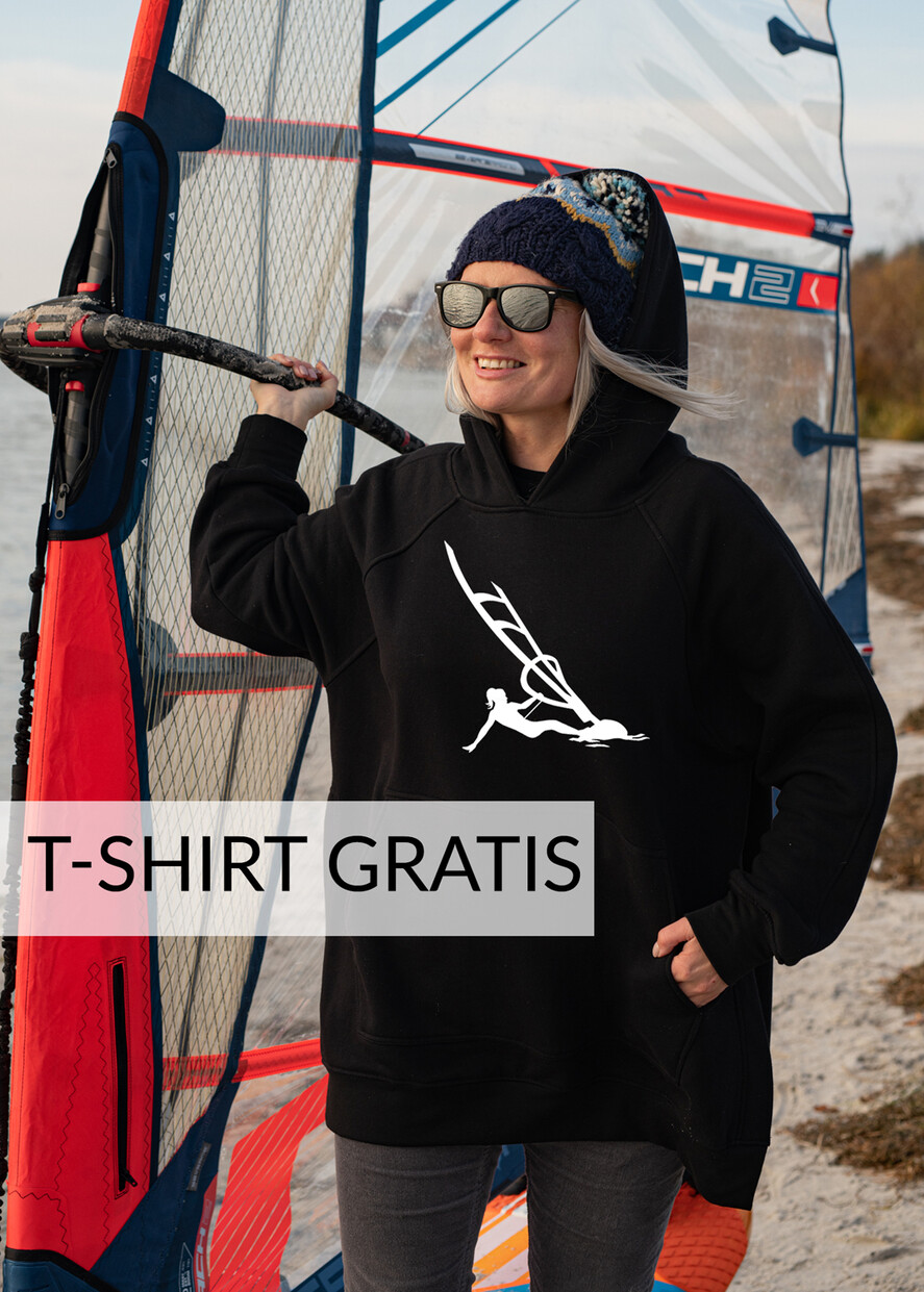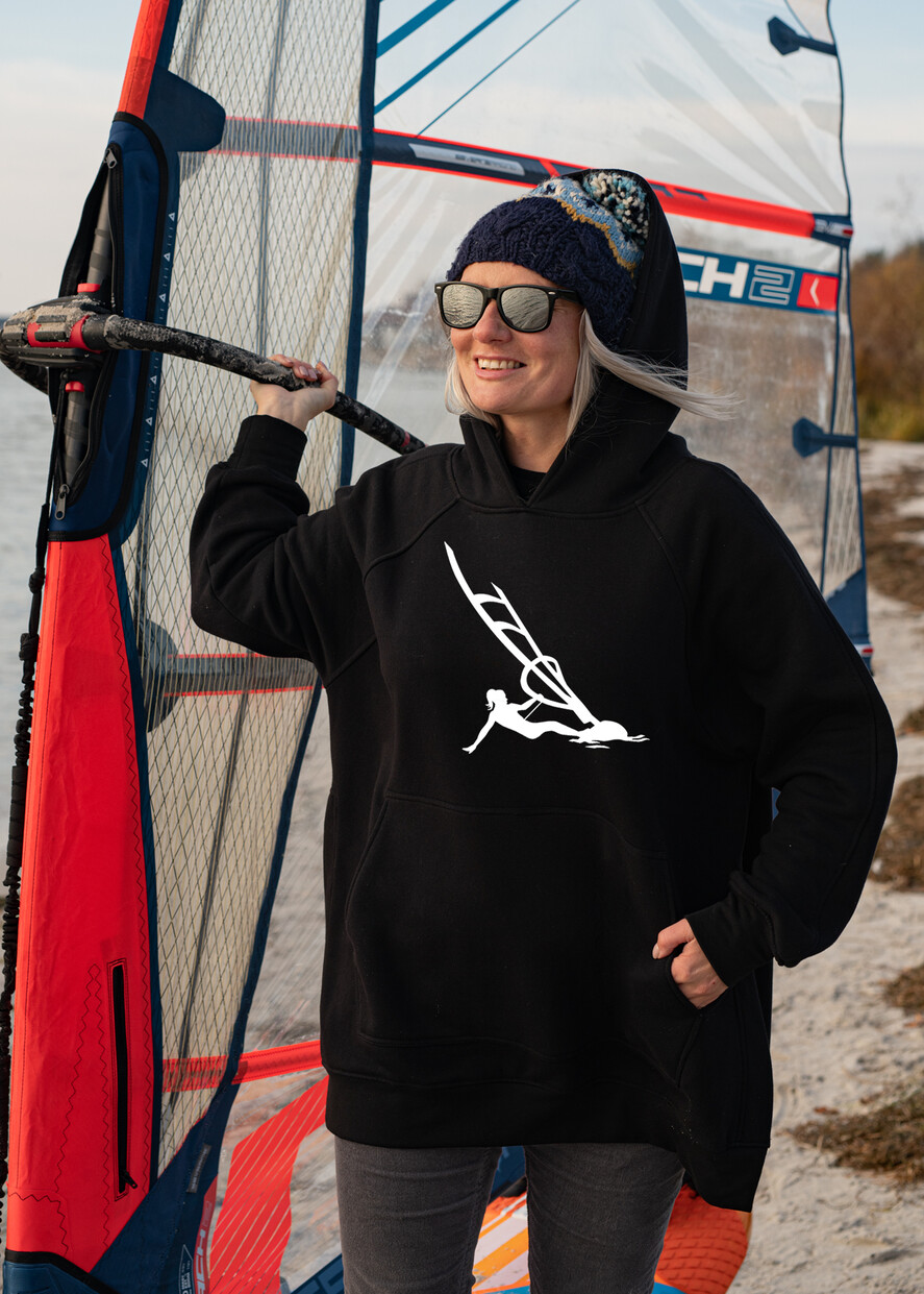 Oversize Czarna bluza damska z kapturem dla fanki windsurfingu - pomysł na prezent dla niej - damska bluza z nadrukiem windsurfing mialo wiać