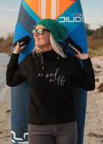 Czarna bluza damska z kapturem dla fanki windsurfingu - pomysł na prezent dla niej - damska bluza z nadrukiem windsurfing mialo wiaćCzarna bluza damska z kapturem dla fanki windsurfingu - pomysł na prezent dla niej - damska bluza z nadrukiem windsurfing no wind no life