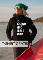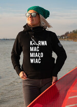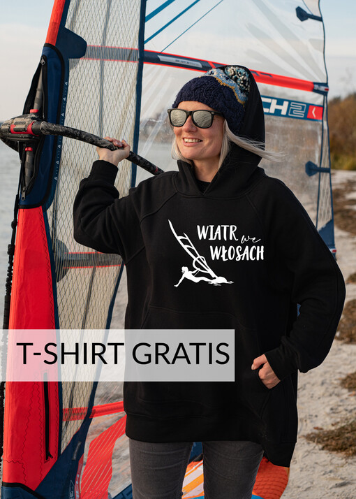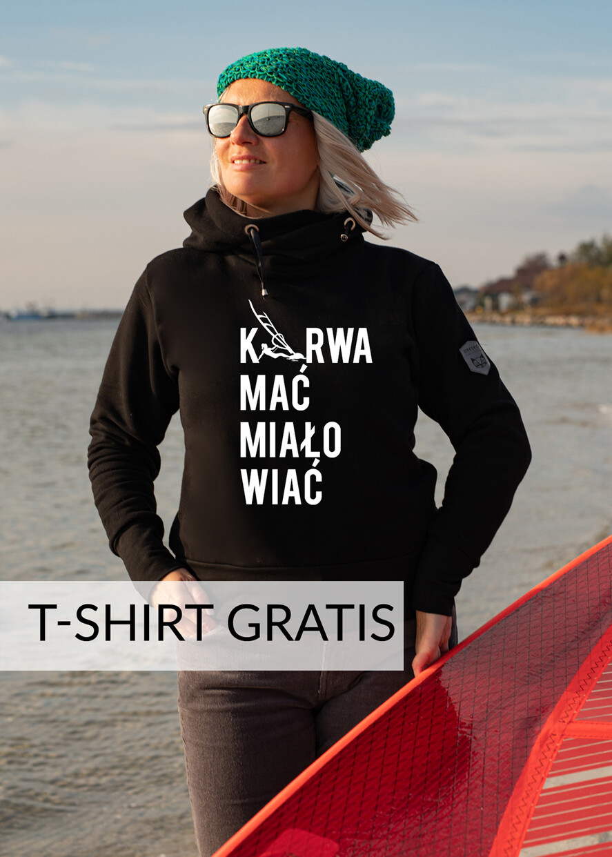 Czarna bluza damska z kapturem dla fanki windsurfingu - pomysł na prezent dla niej - damska bluza z nadrukiem windsurfing mialo wiać