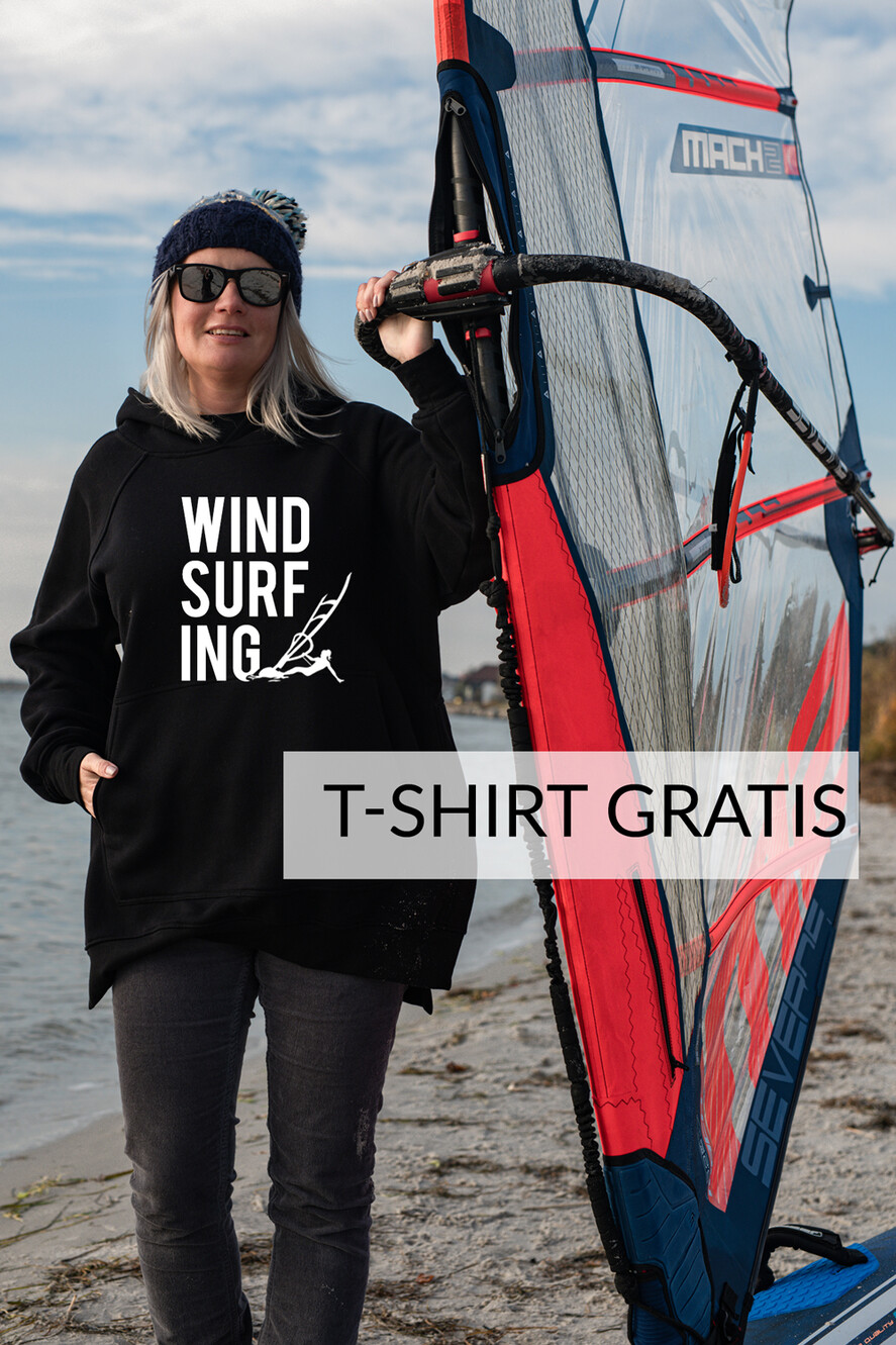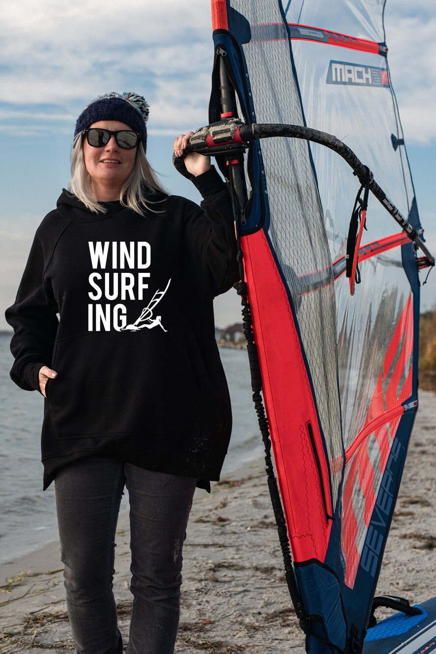 Oversize Czarna bluza damska z kapturem dla fanki windsurfingu - pomysł na prezent dla niej - damska bluza z nadrukiem windsurfing