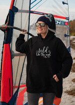 Oversize Czarna bluza damska z kapturem dla fanki windsurfingu - pomysł na prezent dla niej - damska bluza z nadrukiem windsurfing wild like wind