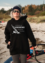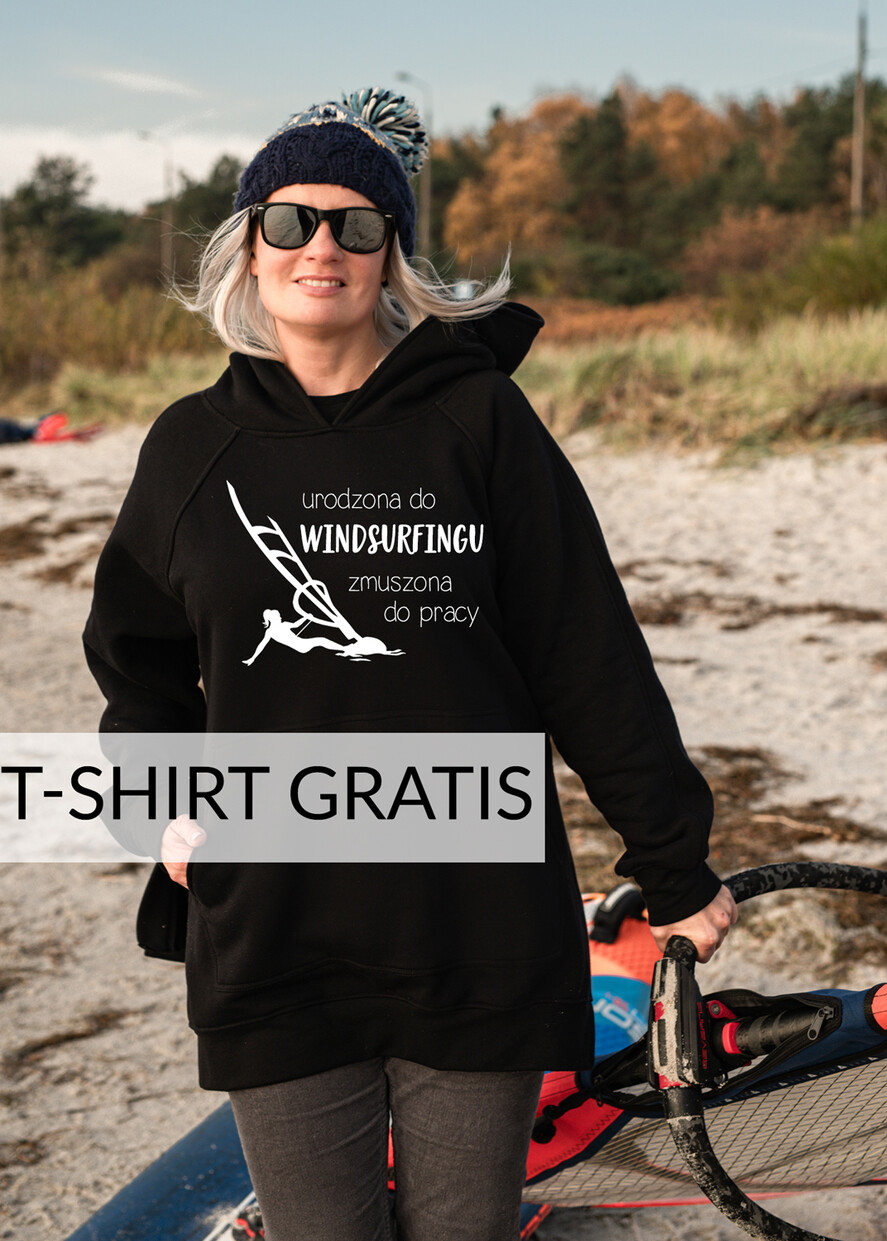 Oversize Czarna bluza damska z kapturem dla fanki windsurfingu - pomysł na prezent dla niej - damska bluza z nadrukiem stworzona do windsurfingu zmuszona do pracy