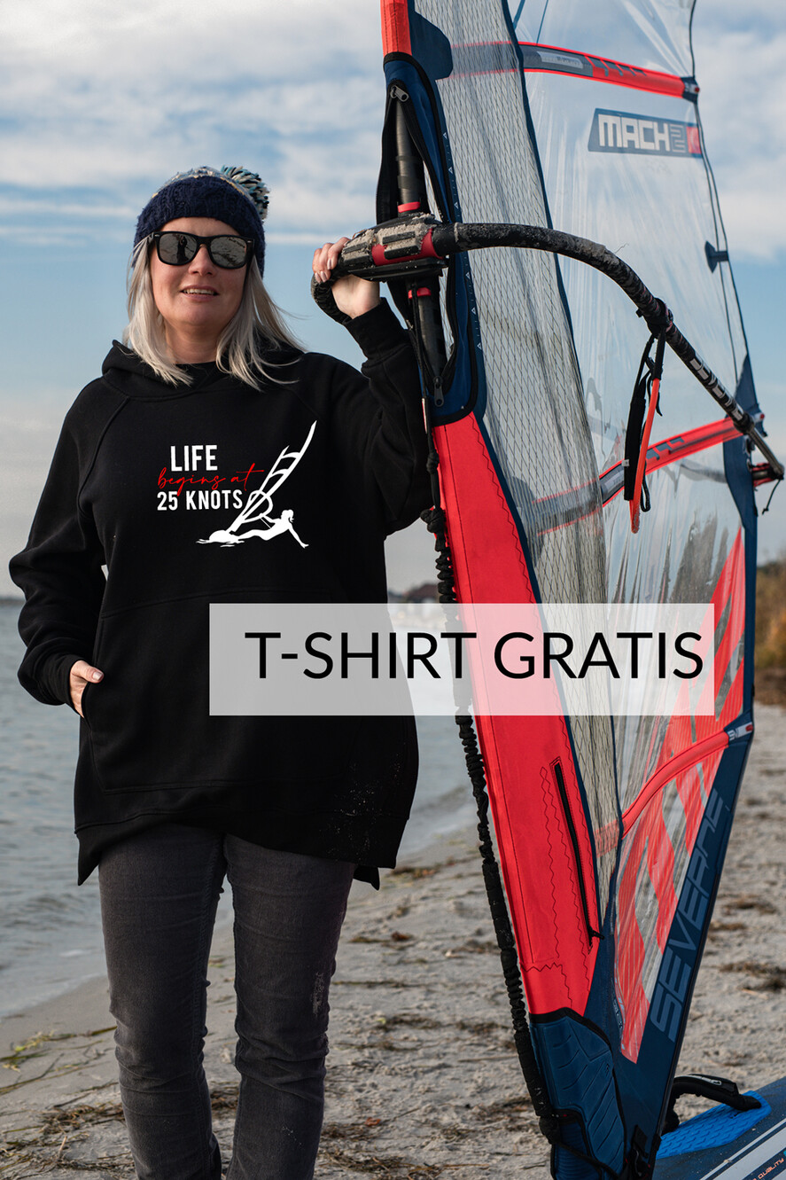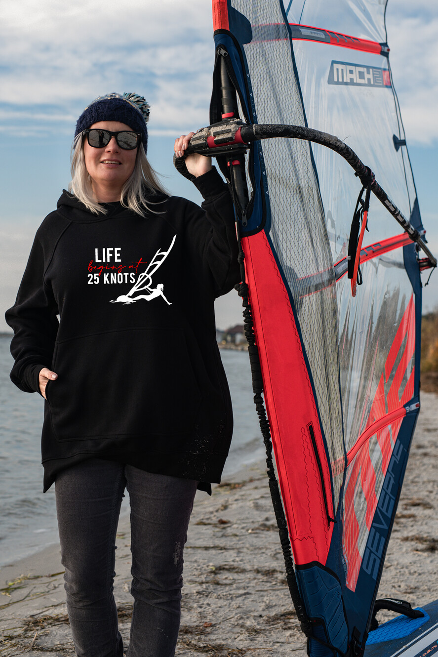 Oversize Czarna bluza damska z kapturem dla fanki windsurfingu - pomysł na prezent dla niej - damska bluza z nadrukiem windsurfing life begins at 25 knots