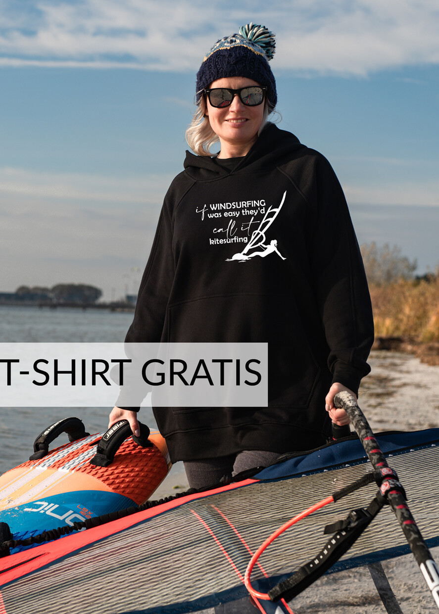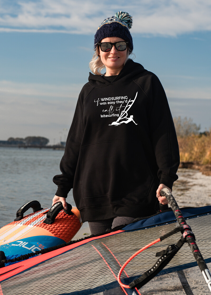 Oversize Czarna bluza damska z kapturem dla fanki windsurfingu - pomysł na prezent dla niej - damska bluza z nadrukiem windsurfing