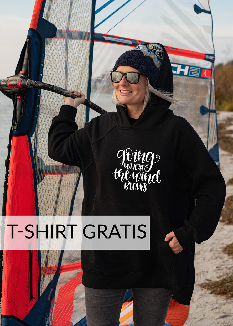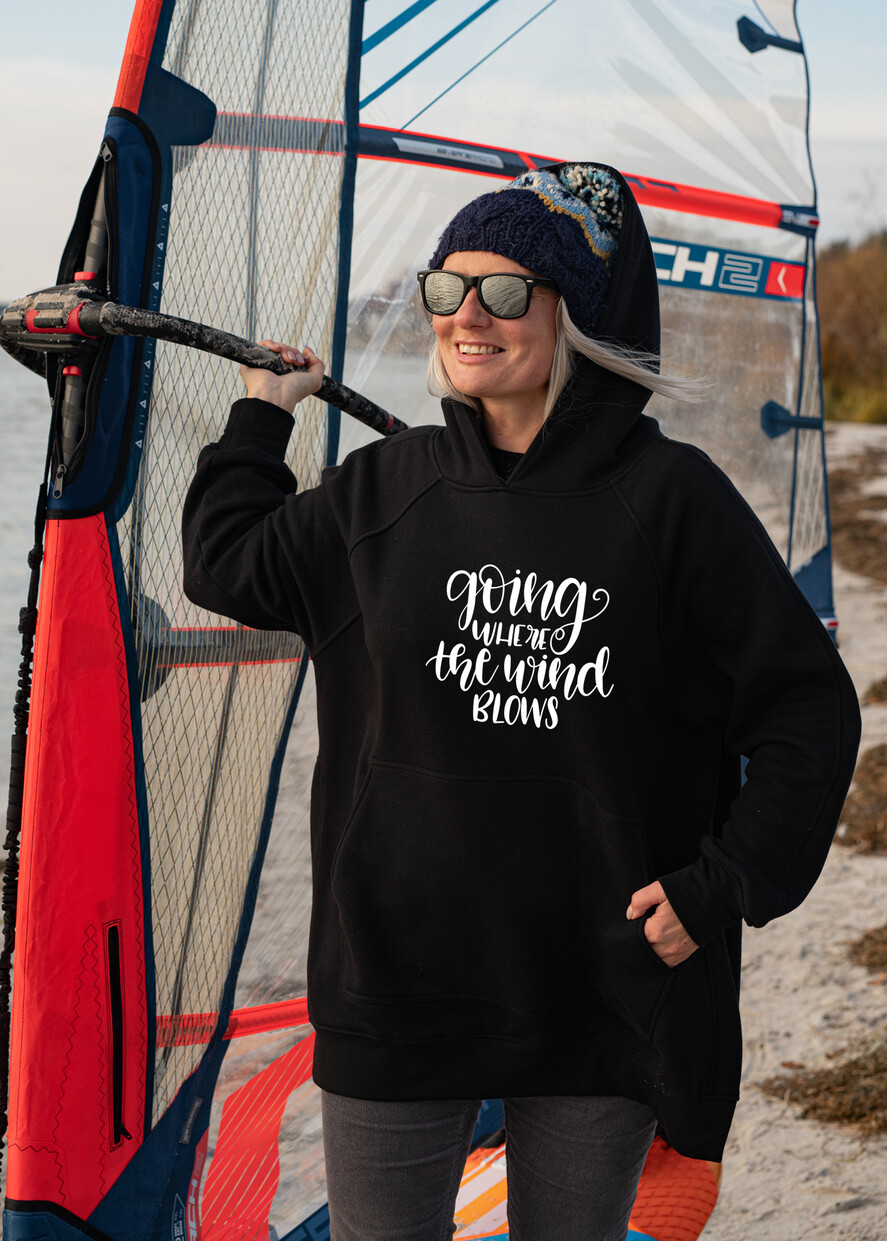 Oversize Czarna bluza damska z kapturem dla fanki windsurfingu - pomysł na prezent dla niej - damska bluza z nadrukiem windsurfing going where wind blows