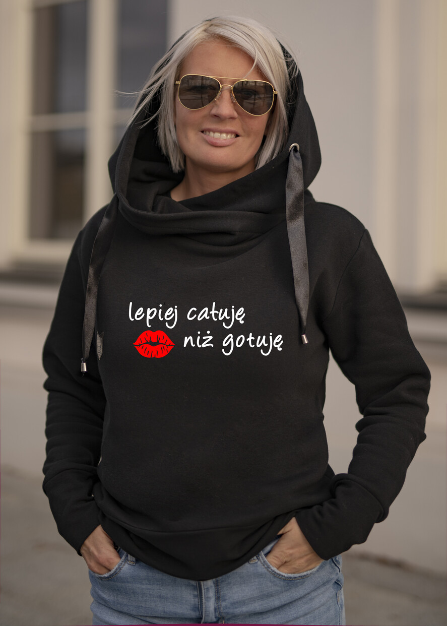 Pomysł na Prezent dla Dziewczyny Damska Bluza Dresowa śmieszne Napisy Czarna Bluza Dresowa z Napisem Lepiej całuje niz gotuję Upominek dla Niej