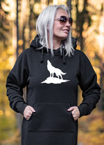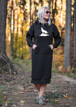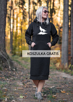 Czarna Sukienka Sportowa Kangurka z wielkim Kapturem z Wilkiem