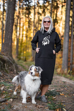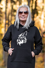 Czarna Sukienka Sportowa Kangurka z wielkim Kapturem z Wilkiem - Sukienka Ciągnie wilka do Lasu