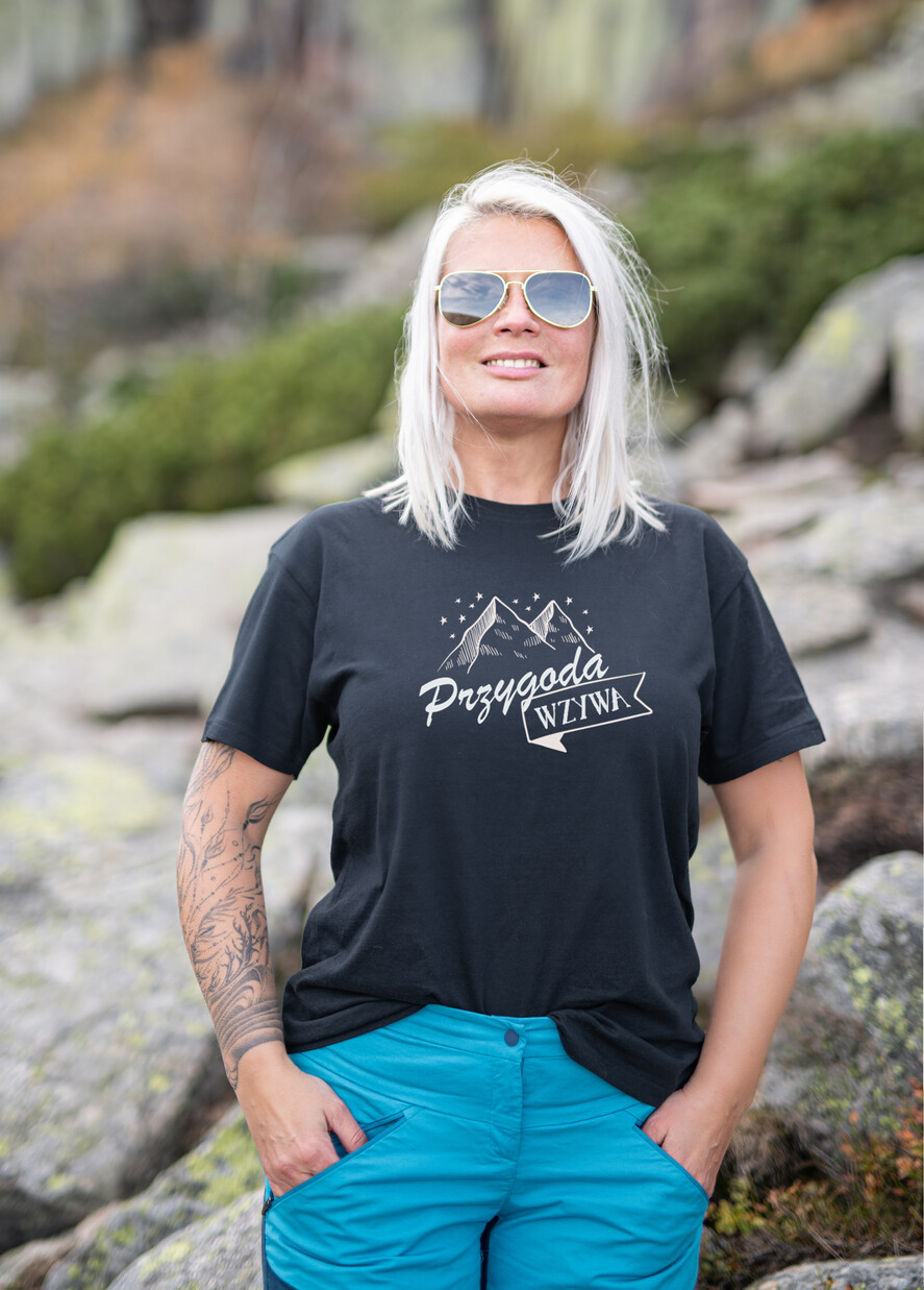 Czarna koszulka z motywem gór - T-shirt damski czarny z nadrukiem gór - idealny prezent dla niej - czarna koszulka Przygoda wzywa