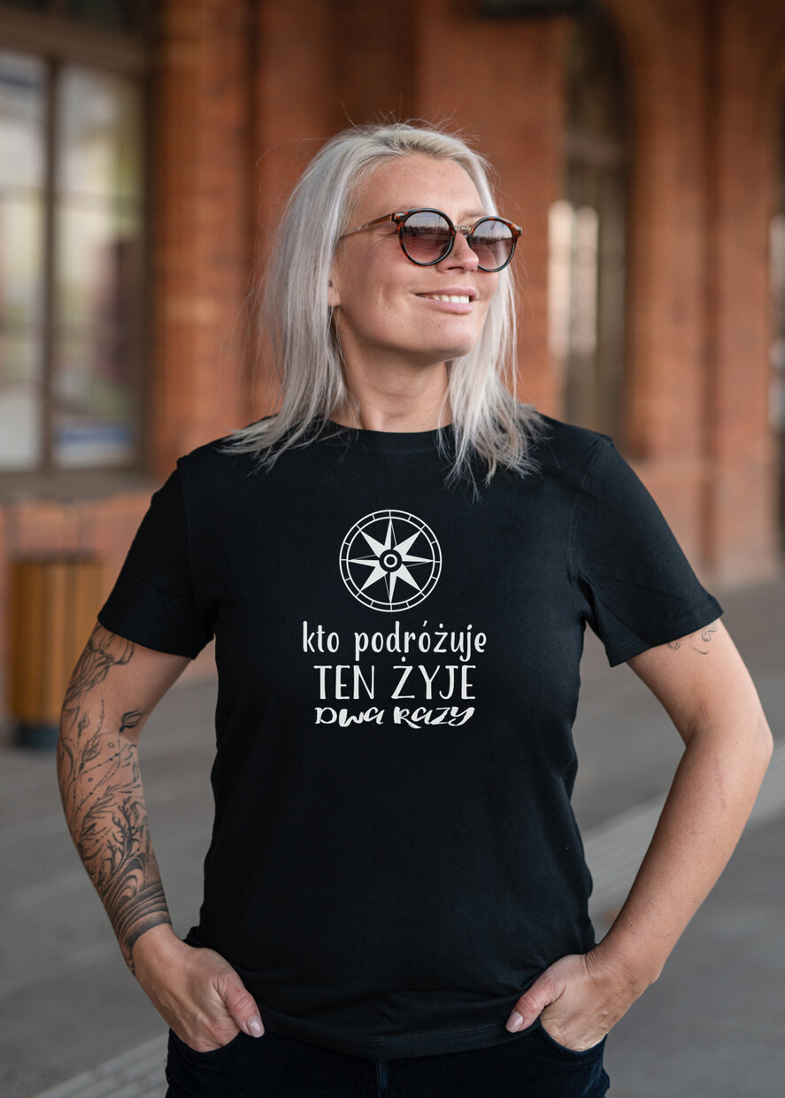Wykonana z doskonałej jakości bawełny czarna Damska Koszulka t-shirt z motywem podróży, to top damski, który pokochasz od pierwszego założenia. Czerń idealnie podkreśla urodę i pasuje na każdą porę roku - nie tylko na jesień.