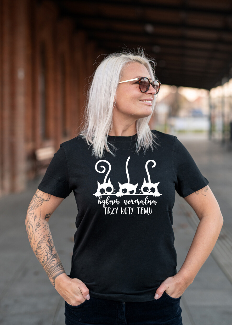 Pomysł na Prezent dla Niej - Koszulka Damska Dla Fanek Kotów - T-Shirt Normalna byłam3 koty Temu