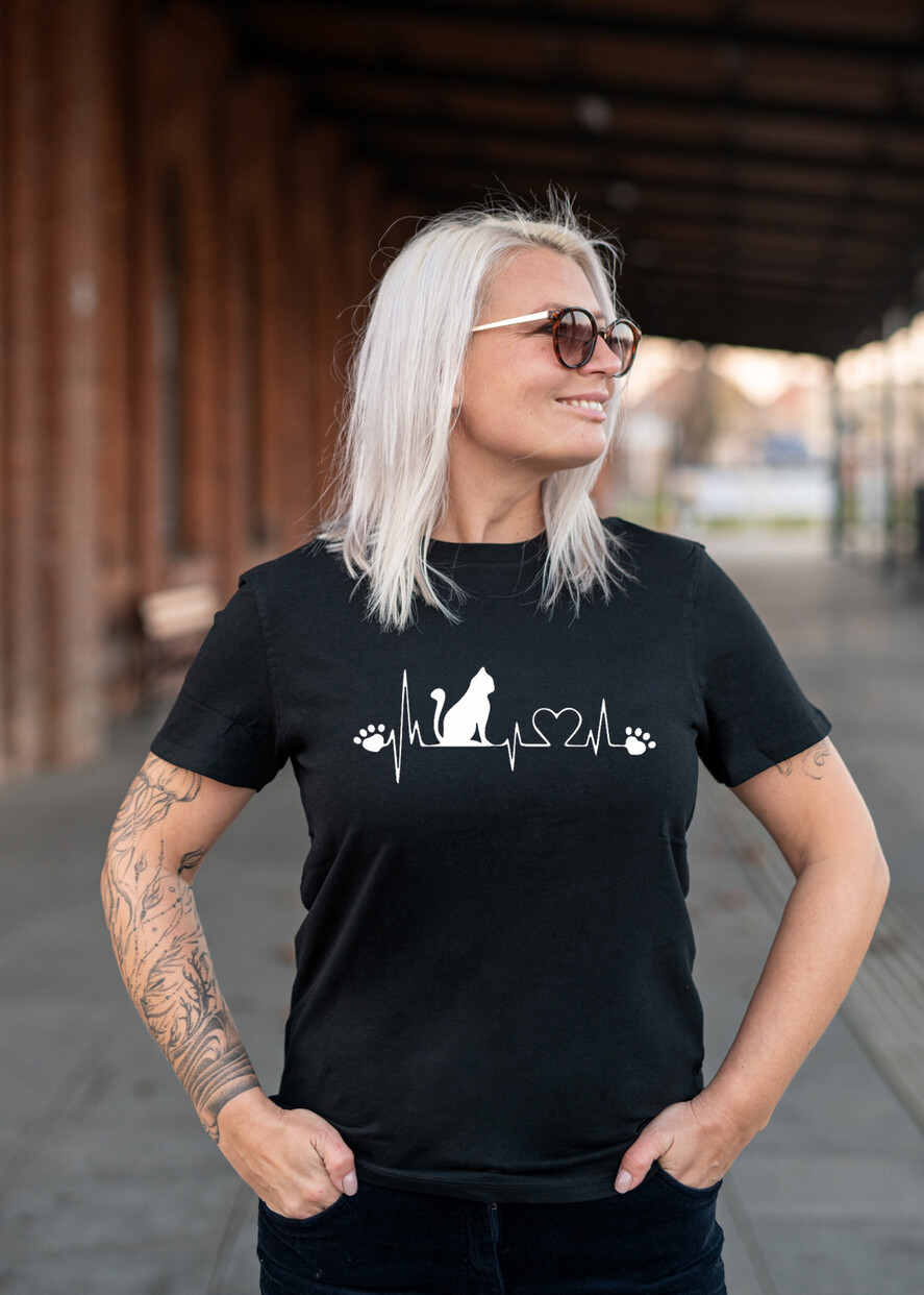 Pomysł na Prezent dla Niej - Koszulka Damska Dla Fanek Kotów - T-Shirt koci rytm serca