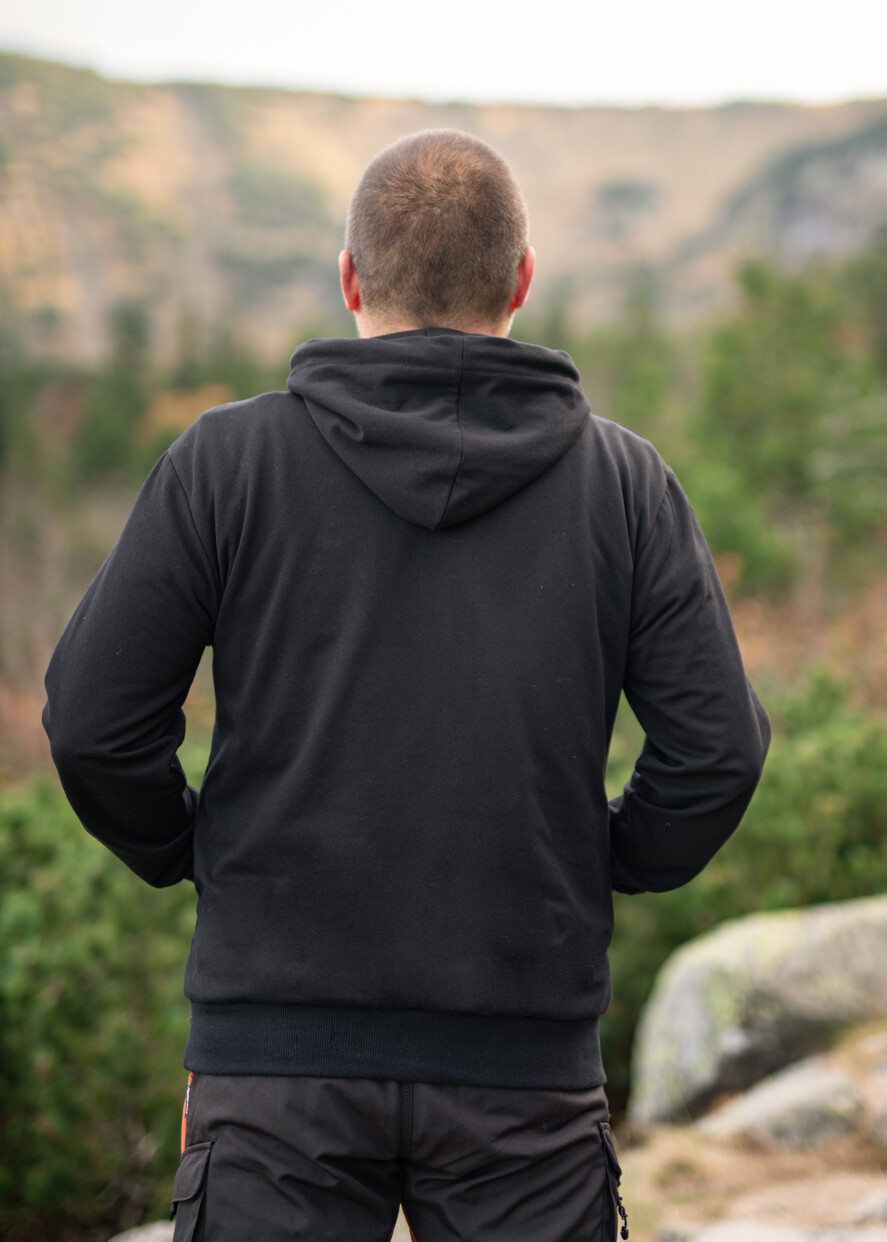 Wykonana z doskonałej jakości bawełny czarna męska bluza z kapturem i górami, to bluza którą pokochasz od pierwszego założenia. Czerń pasuje na każdą porę roku - nie tylko na jesień.