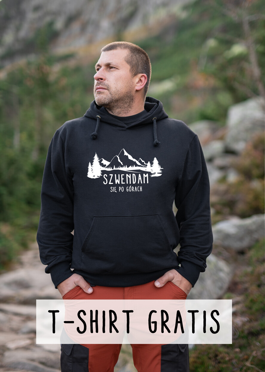 Taka Klasyczna Bluza w czarnym kolorze z kapturem to idealny pomysł na prezent dla miłośnika górDo Tej wygodnej bluzy męskiej z kapturem - dołączamy Tshirt z górskim rytmem serca