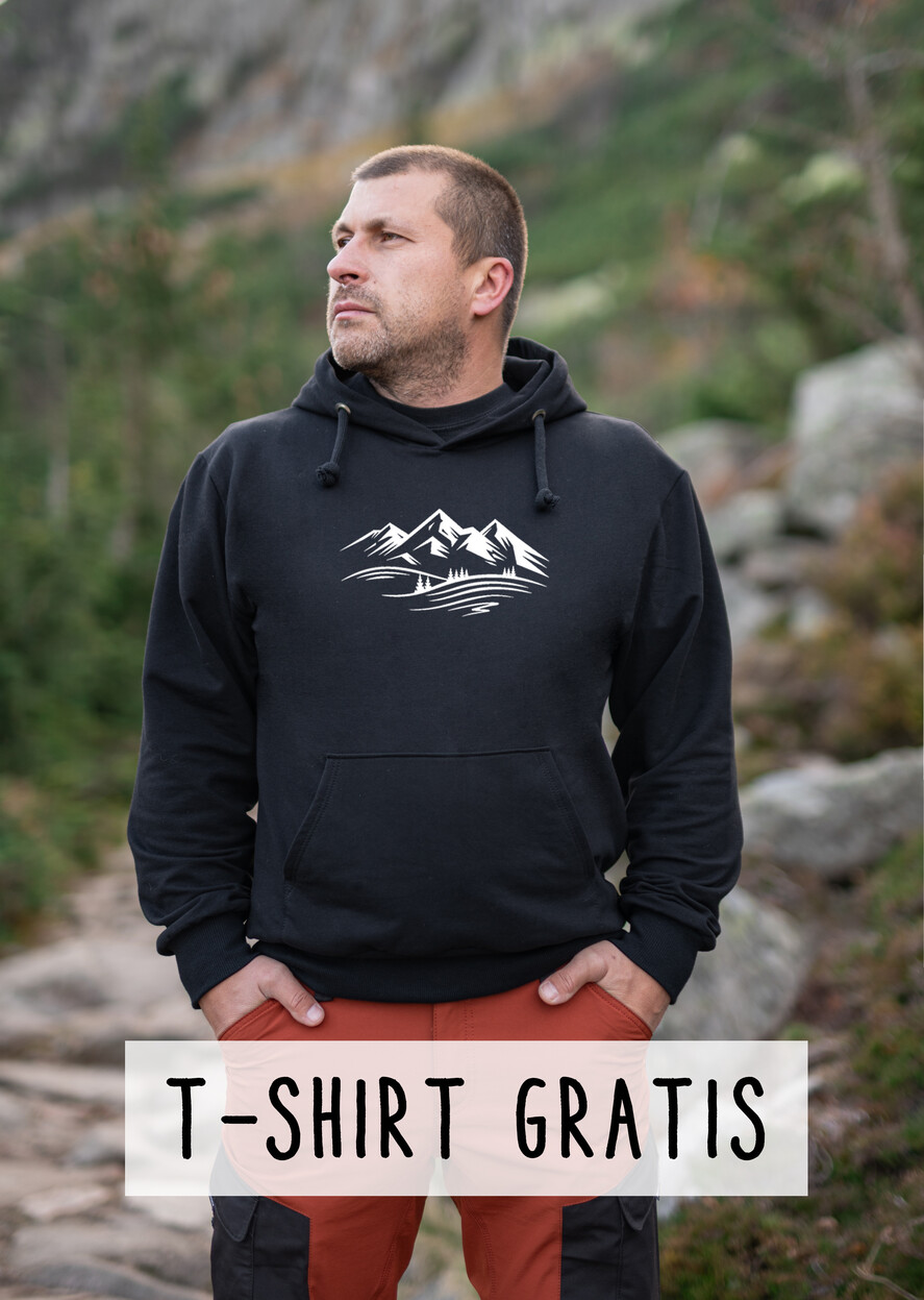 Taka Klasyczna Bluza w czarnym kolorze z kapturem to idealny pomysł na prezent dla miłośnika górDo Tej wygodnej bluzy męskiej z kapturem - dołączamy Tshirt z górskim rytmem serca