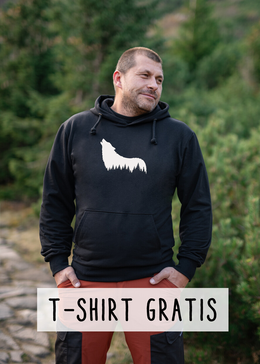 Taka Klasyczna Bluza w czarnym kolorze z kapturem to idealny pomysł na prezent dla miłośnika górskich wycieczek - trekingu- spacerów po lesie - leśnikówDo Tej wygodnej bluzy męskiej z kapturem - dołączamy Tshirt