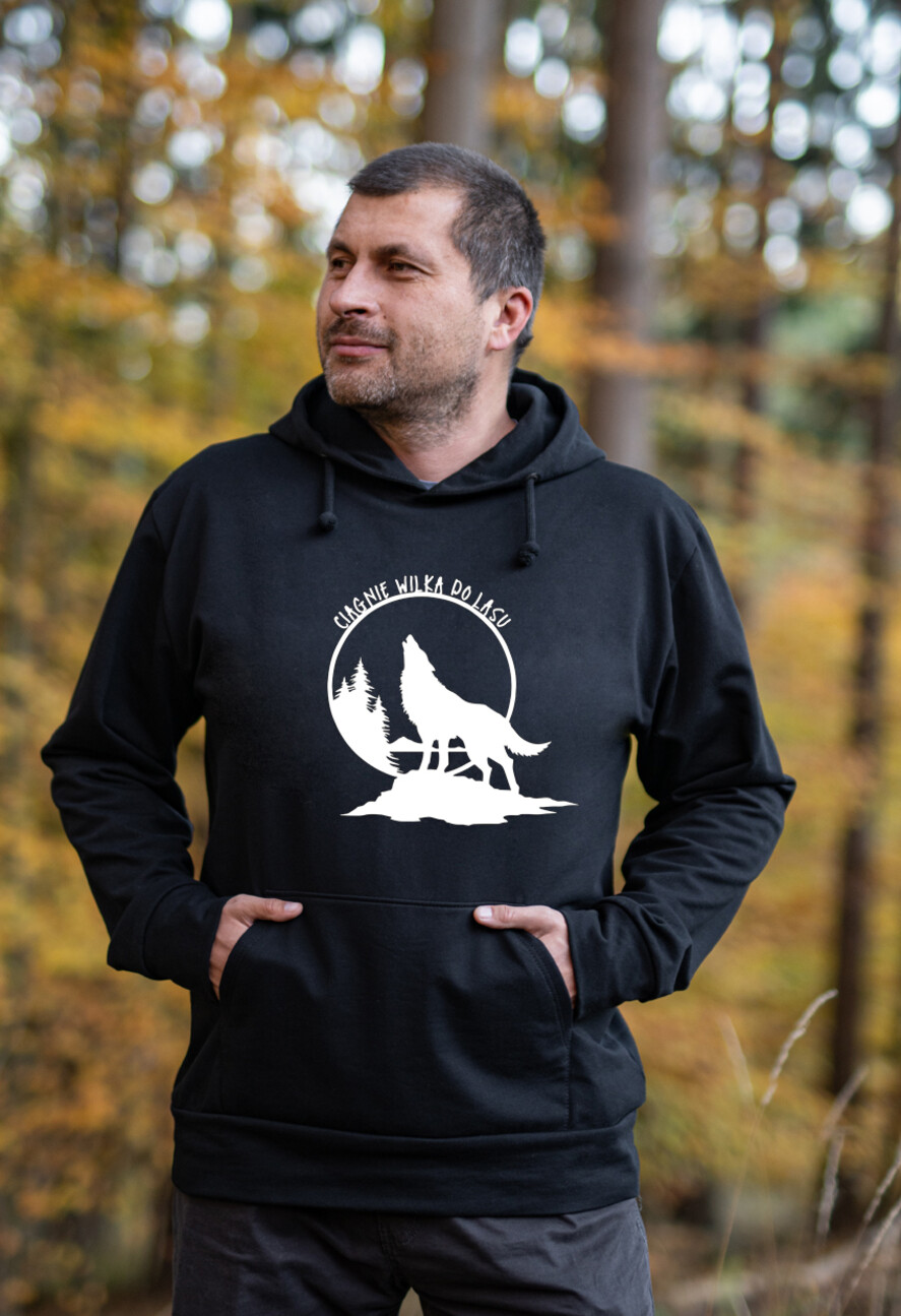 Pomysł Na Prezent dla Niego - Bluza dresowa Męska z Kapturem - ciagnie wilka do Lasu - Męska Czarna bluza