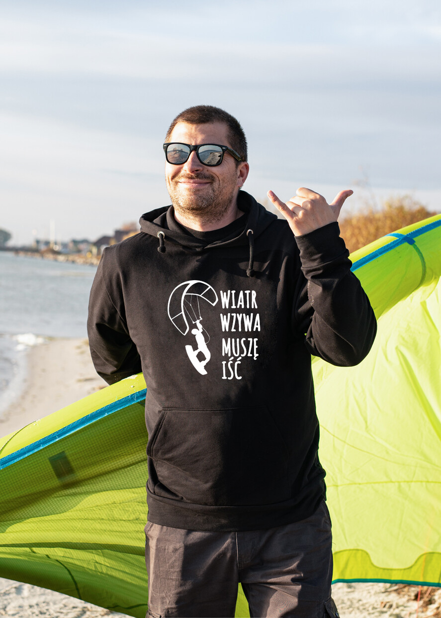 Pomysł na Prezent dla Kajciarza Męska Bluza dresowa z Kapturem dla fana Kitesurfingu Wiatr wzywa Praktyczny Prezent dla chłopaka