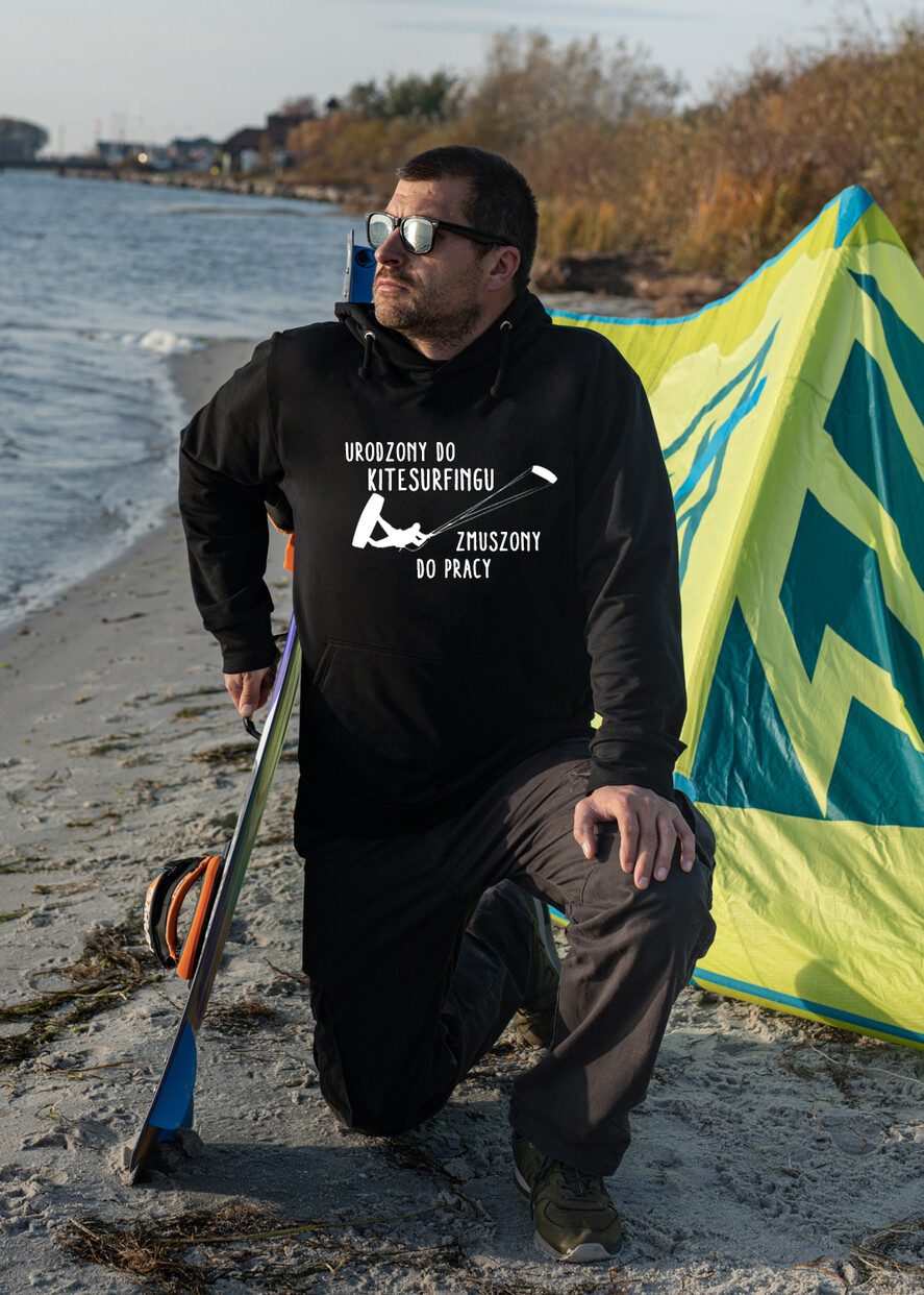 Piękna Bawełniana bluza męska z kapturem i kiszonka kangurką w klasycznej czerni kitesurfing - idealnie nadaje się na prezent dla miłośników sportów wodnych