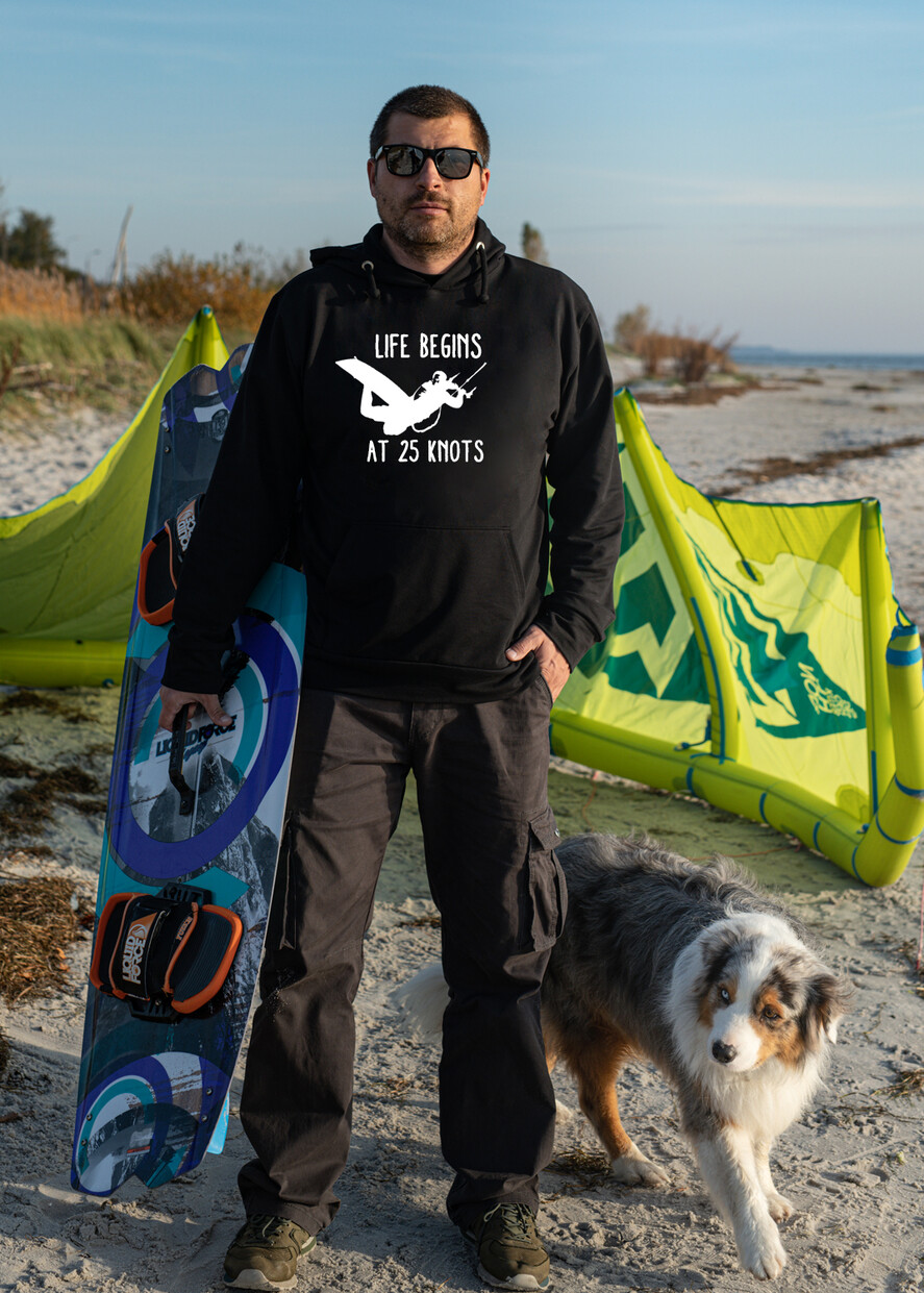 Piękna Bawełniana bluza męska z kapturem i kiszonka kangurką w klasycznej czerni kitesurfing - idealnie nadaje się na prezent dla miłośników sportów wodnych