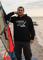 Piękna Bawełniana bluza męska z kapturem i kieszonka kangurką w klasycznej czerni windsurfing - idealnie nadaje się na prezent dla miłośników sportów wodnych zarówno dla tych co kochaja flat jak i wave !