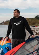 Piękna Bawełniana bluza męska z kapturem i kieszonka kangurką w klasycznej czerni windsurfing - idealnie nadaje się na prezent dla miłośników sportów wodnych zarówno dla tych co kochaja flat jak i wave !