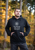 Czarna bluza męska z kapturem i nadrukiem - kto podróżuje, ten żyje dwa razy