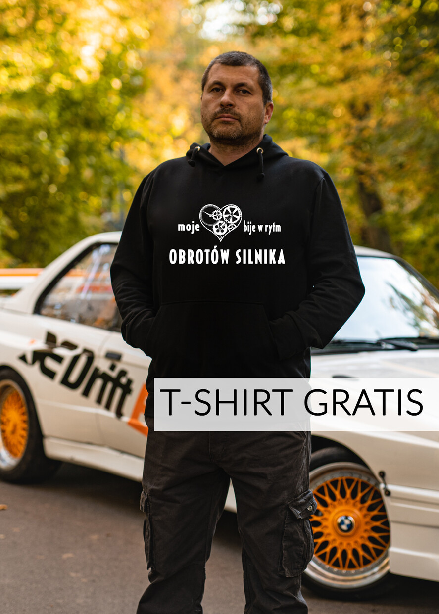 Do Tej wygodnej bluzy męskiej z kapturem - dołączamy Tshirt z motywem motoryzacyjnym