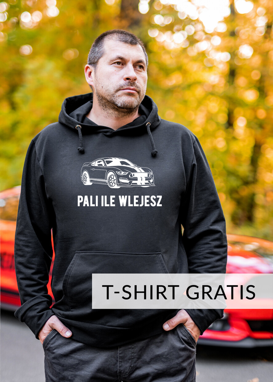 Taka Klasyczna Bluza w czarnym kolorze z kapturem to idealny pomysł na prezent dla motomaniakaDo Tej wygodnej bluzy męskiej z kapturem - dołączamy Tshirt z motywem motoryzacyjnym