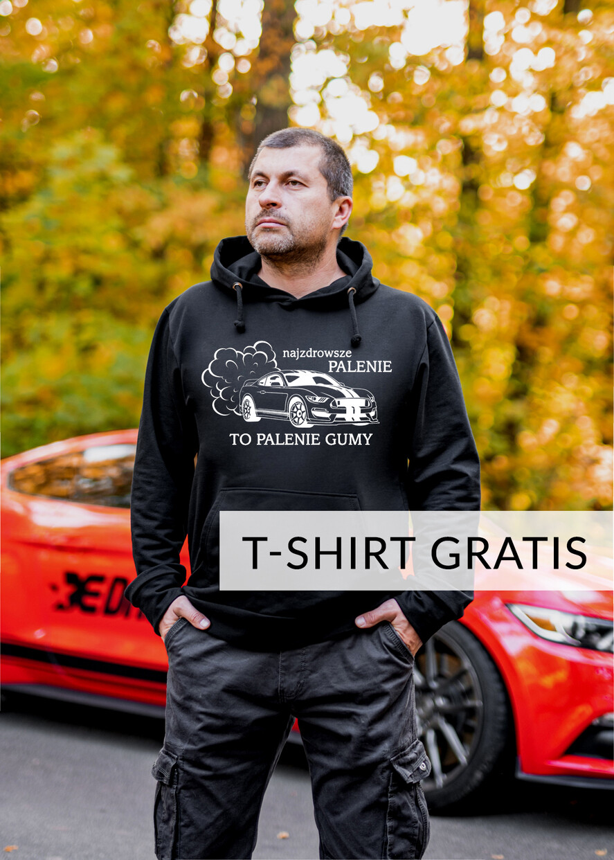 Taka Klasyczna Bluza w czarnym kolorze z kapturem to idealny pomysł na prezent dla motomaniakaDo Tej wygodnej bluzy męskiej z kapturem - dołączamy Tshirt z motywem motoryzacyjnym