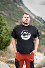 Wygodna dzianinowa Bawełniana Koszulka męska w klasycznej czerni z motywem gór- idealnie nadaje się na prezent dla miłośników górskich wycieczek.