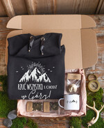 Pudełko prezentowe z czarną bluzą damską z górami i kubkiem oraz dodatkami. Zestaw prezentowy dla niej na każdą okazję.