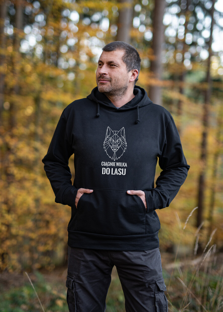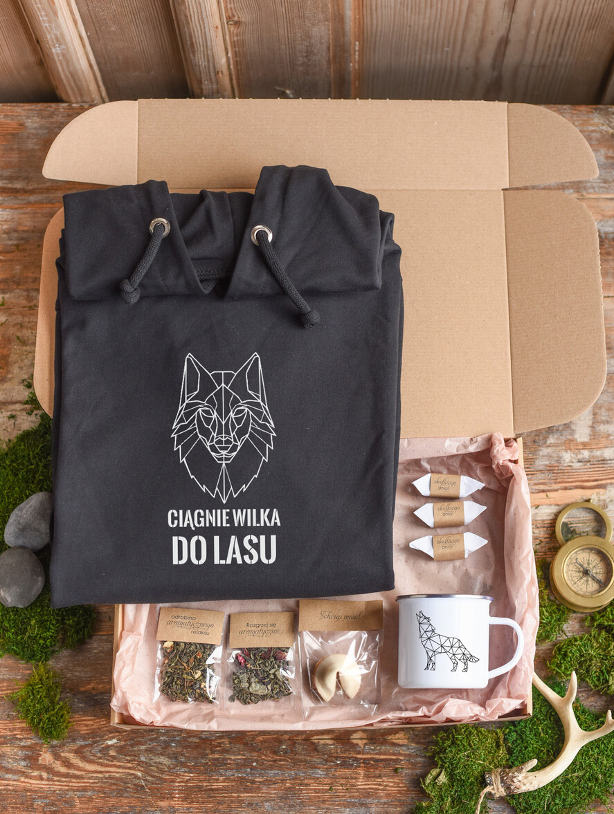 pudełko prezentowe dla niego - bluza z kapturem i z nadrukiem - ciągnie wilka do lasu. Czarna bluza z kapturem i dodatkami w prezencie dla niego