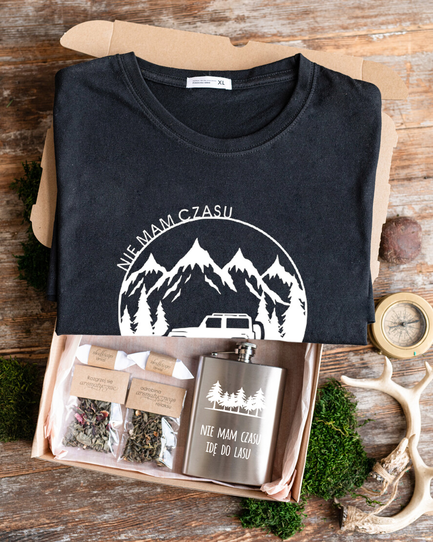 Pudełko prezentowe z czarną koszulką męską T-shirt i piersiówką oraz dodatkami. Prezent dla Niego - czarny T-shirt