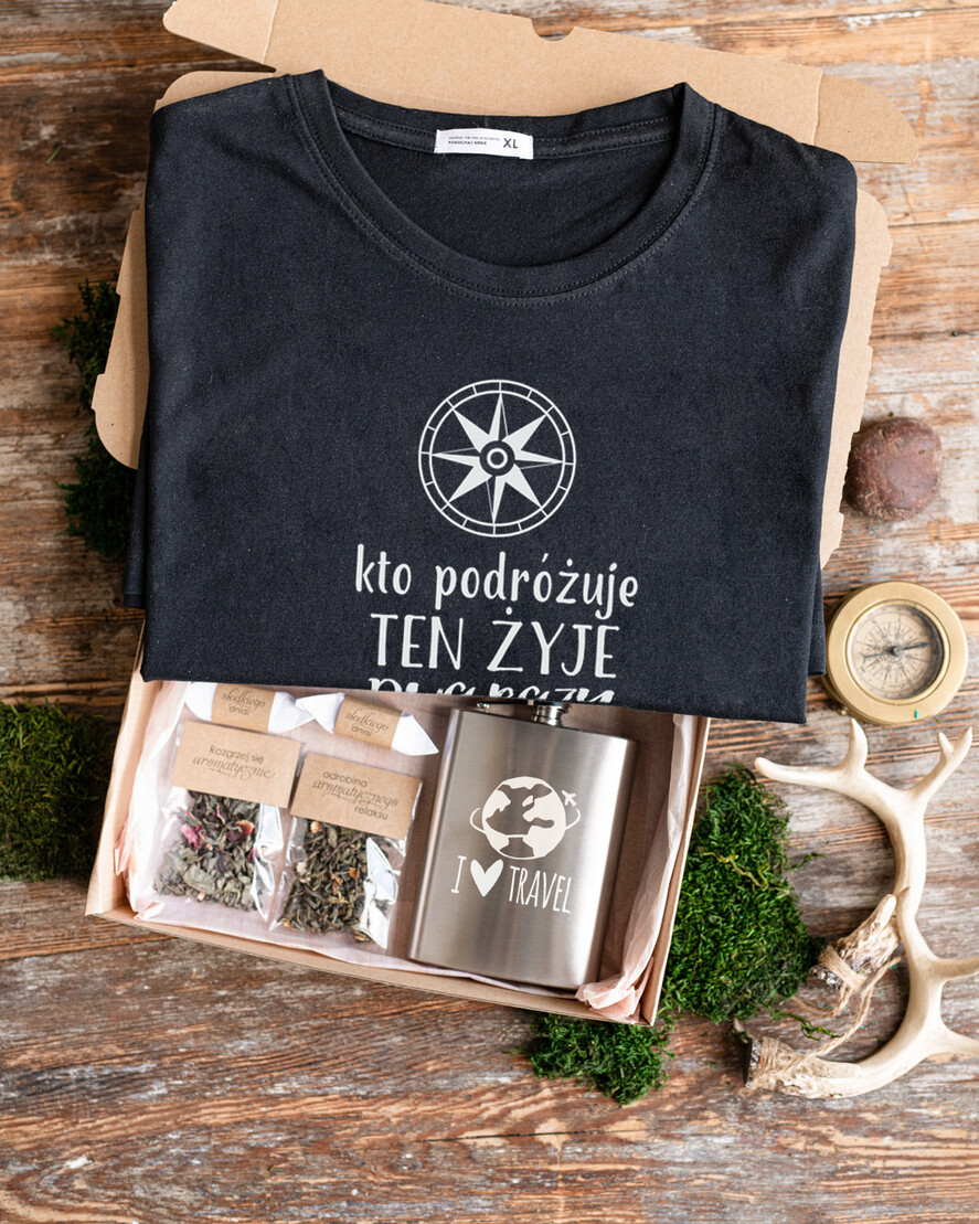 Pudełko prezentowe z dodatkami i z czarną koszulką męską T-shirt z napisem - kto podróżuje ten żyje dwa razy.
