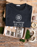 Czarna koszulka T-shirt męska z nadrukiem - kto podróżuje ten żyje dwa razy - pomysł na prezent dla niego - pudełko prezentowe z koszulką