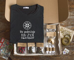 Pudełko prezentowe z dodatkami i z czarną koszulką męską T-shirt z napisem - kto podróżuje ten żyje dwa razy.
