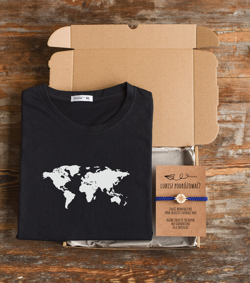 Koszulka czarna dla mężczyzny podróżnika - idealny prezent dla niego - pudełko prezentowe z T-shirtem